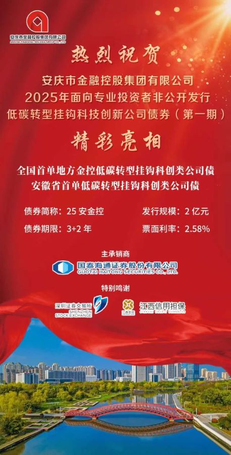 9月9日,安庆金控集团在深圳证券交易所成功发行低碳转型挂钩科技创新公司债券“25安金控”,本期债券是安庆金控集团首次亮相资本市场,发行规模2亿元,发行期限3+2年期,票面利率2.58%,为国内首单地方金控低碳转型挂钩科创类公司债,也是省内首单低碳转型挂钩科创类公司债。