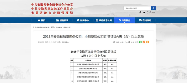 近日,省委金融办公布2025年安徽省融资担保公司监管评级结果。在全省参与评级的148家机构中,安庆市担保公司以扎实的经营管理和稳健的综合实力,荣获最高级别监管评级——AAA级,成为全市政府性融资担保机构中唯一获此殊荣的单位。